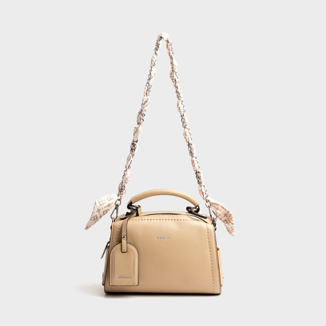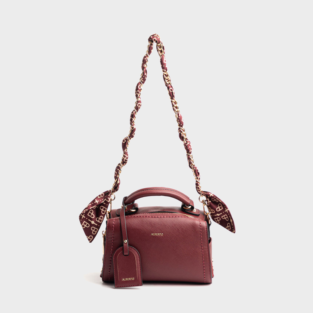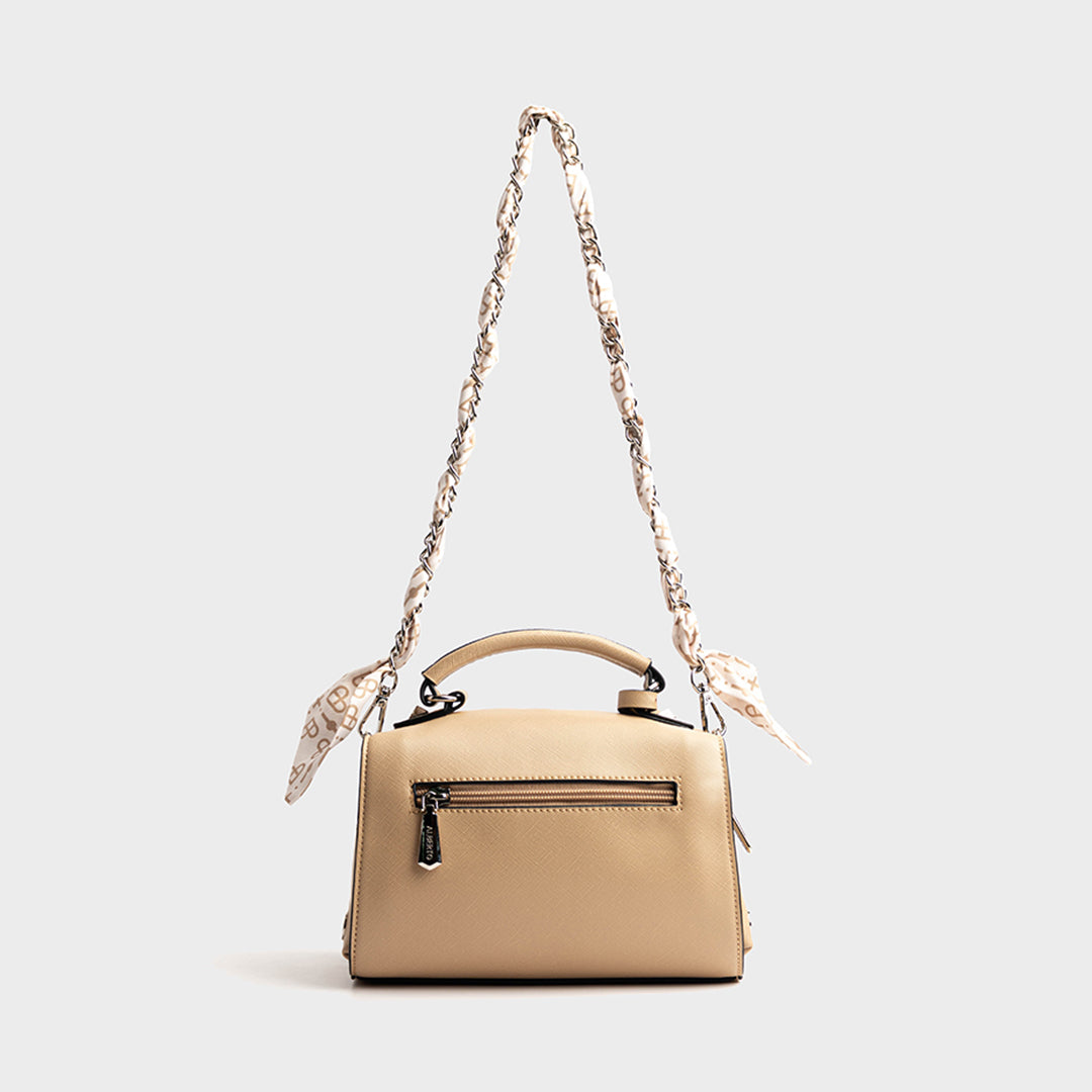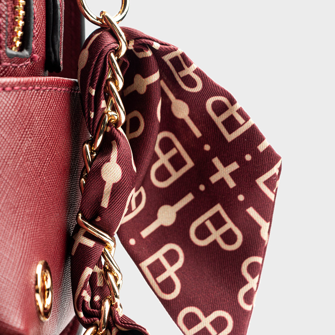 Feature: Smooth PU leather, Chain strap with silk scarf